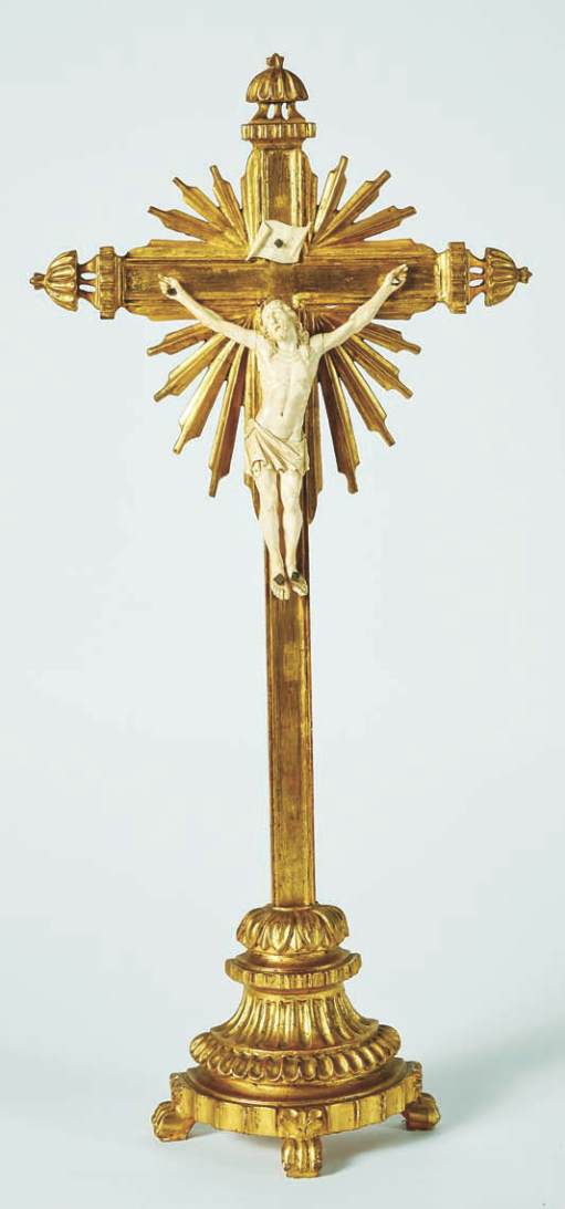 ivory carving, carved and gilt wooden cross and base with ivory