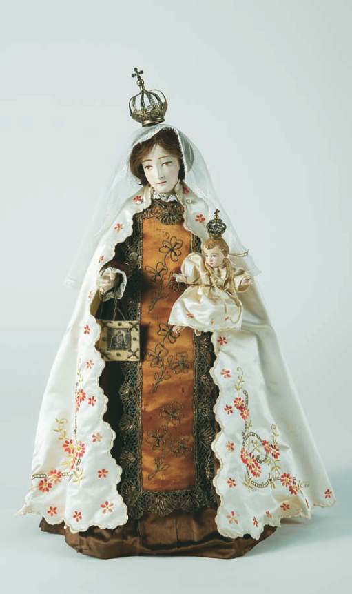 escultura de roca em madeira, vestes em tecido,