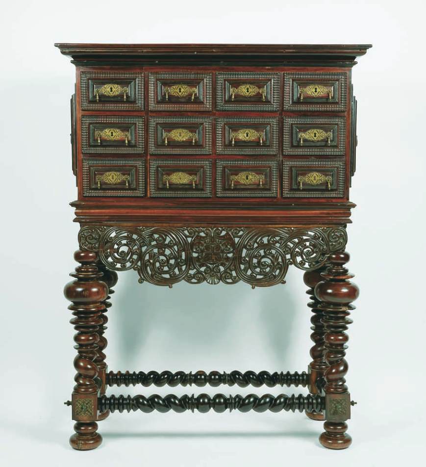 pernas e travessas torneadas, ferragens em bronze recortado e vazado,
