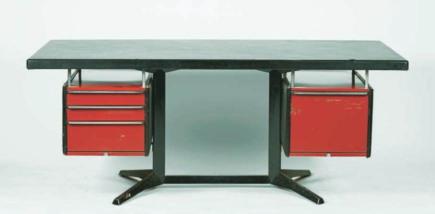 estrutura de metal lacada a negro, tampo e laterais revestidos a pele negra, gavetas de metal lacado a bordeaux